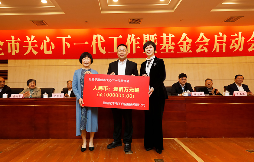 4月14日,公司董事長兼總裁陳曉先生代表溫州宏豐向市關心下一代基金會捐款100萬元人民幣,為推動崇高事業薪火相傳,奮力書寫溫州市關心下一代事業新篇章,實現溫州高質量跨越式發展貢獻企業應有力量。
